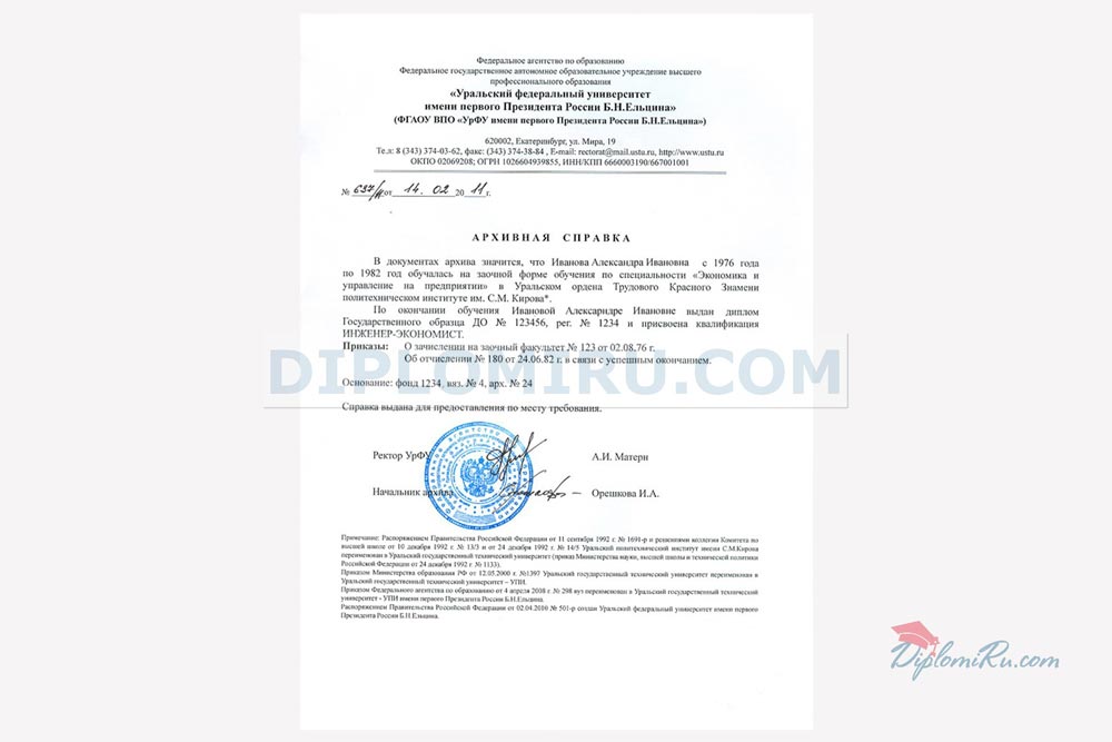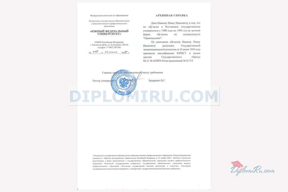На нашем сайте Вы можете купить архивную справку для подтверждения факта вашего обучения в ВУЗе или ССУЗе. Справка изготавливается на обыкновенной бумаге формата А4, заполняется по стандарту или по образцу реально выданных в том или ином учебном заведении справок. За долгие годы работы мы накопили огромное количество таких образцов и готовы сделать их точную копию, но с Вашими данными. Печати и подписи соответствуют оригиналам. ВНИМАНИЕ СКИДКИ! В комплекте с дипломом высшего образования или среднего профессионального дешевле. Скидка по 2000 рублей на каждый документ при покупке 2х и более позиций.